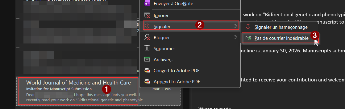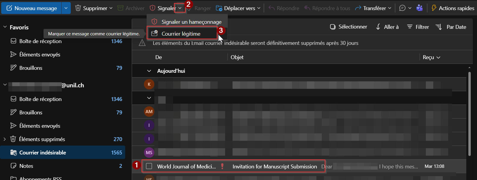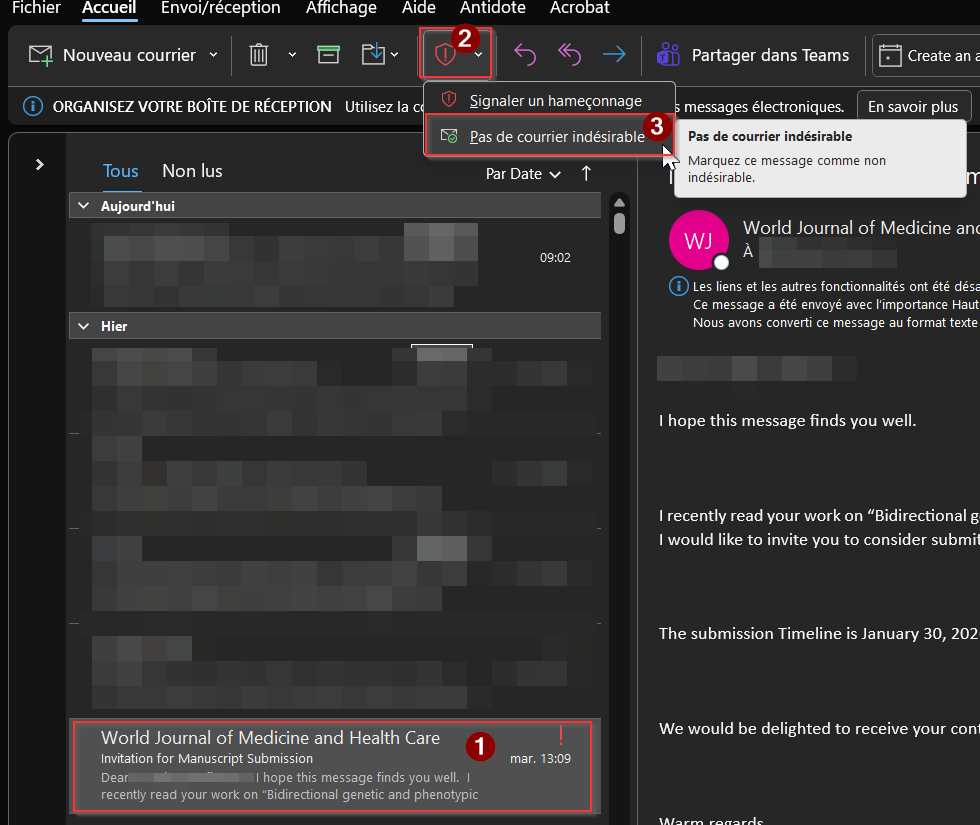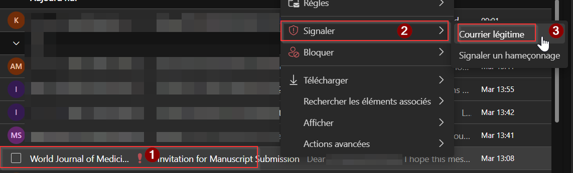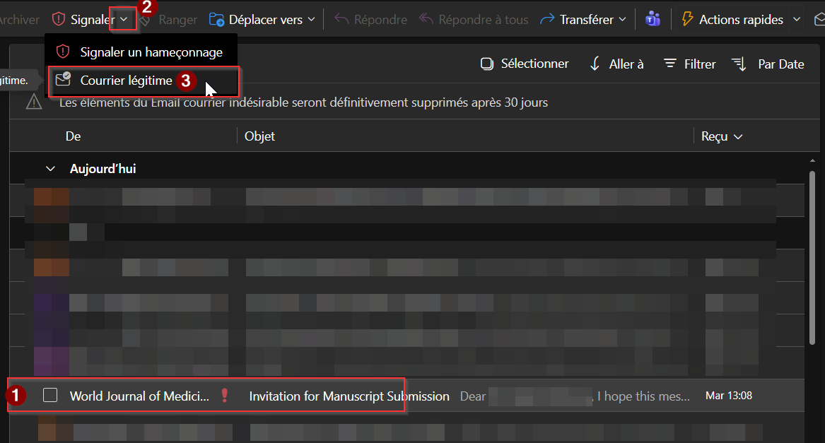 Un faux positif est quand un courriel légitime se fait bloquer, ou détecter comme étant indésirable. Merci de nous remonter cela en signalant ces messages directement depuis Outlook. Cela nous permettra de régler nos filtres pour pas que cela se reproduise.