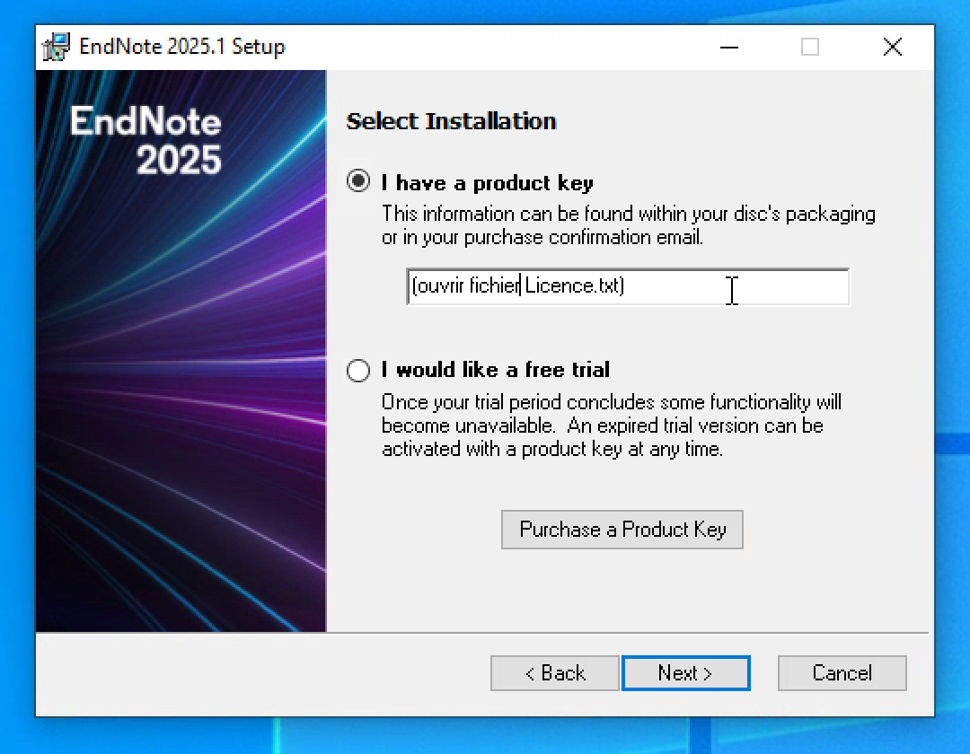 - Saisir la clé de licence qui se trouve dans le ficheir Licence.txt et cliquer sur "Next"