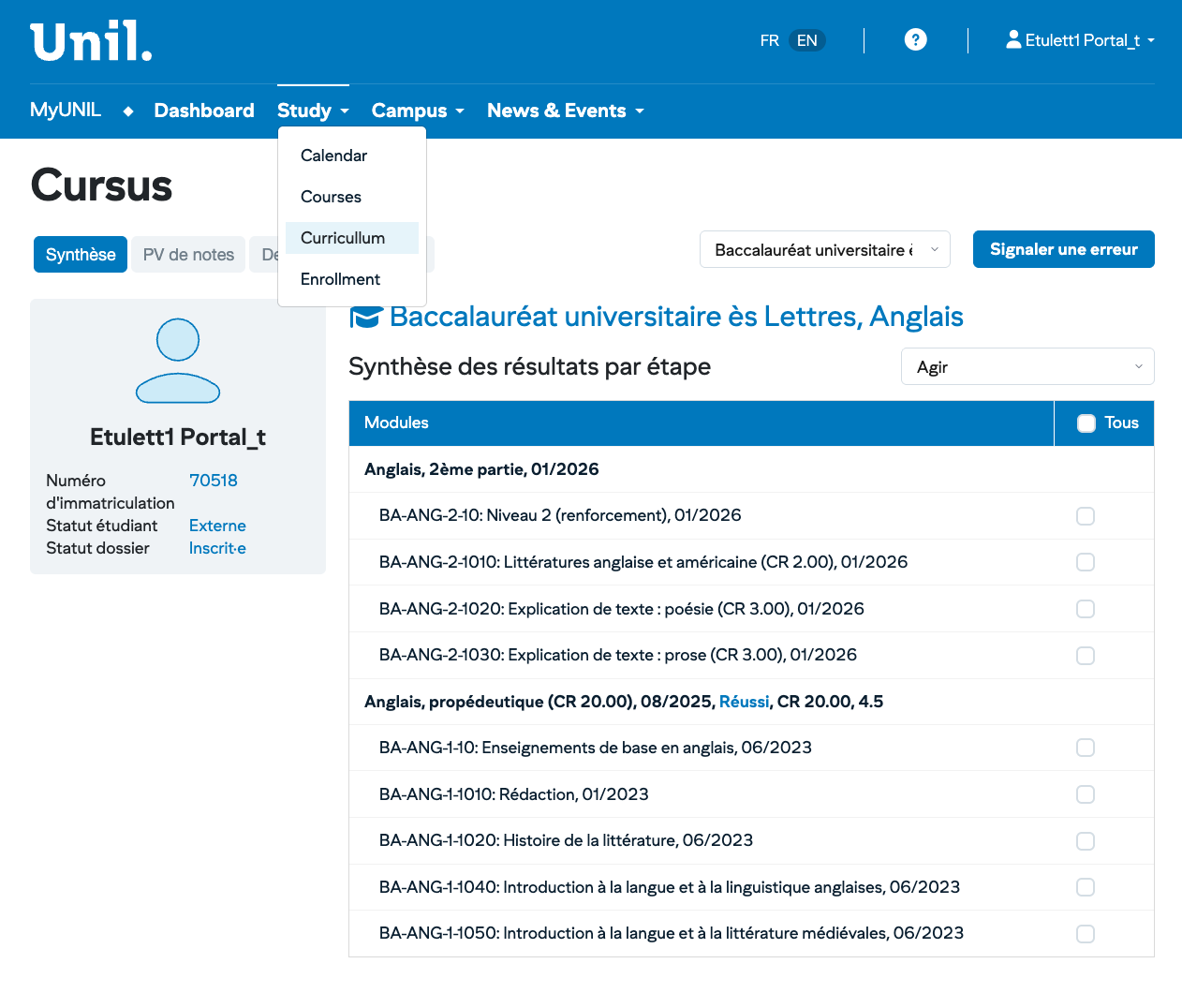 Students can access a synopsis of their academic “Cursus” as well as the corresponding PVs.