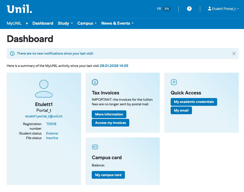 The dashboard is the homepage of MyUNIL. It provides you with a personalised overview of your university activity and quick access to the most frequently used features.