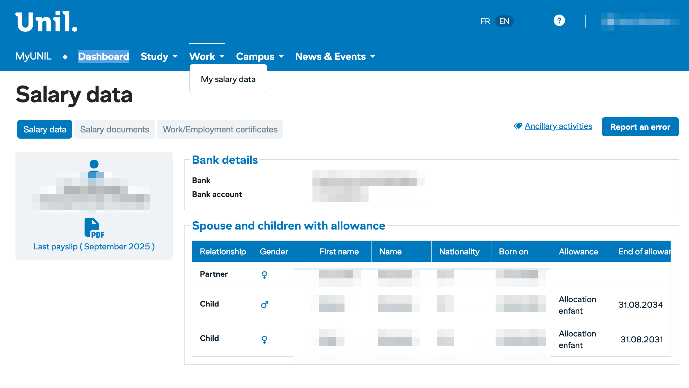 The Salary Data section allows you to view all information related to your employment at UNIL: pay slips, bank details, family information and work certificates.