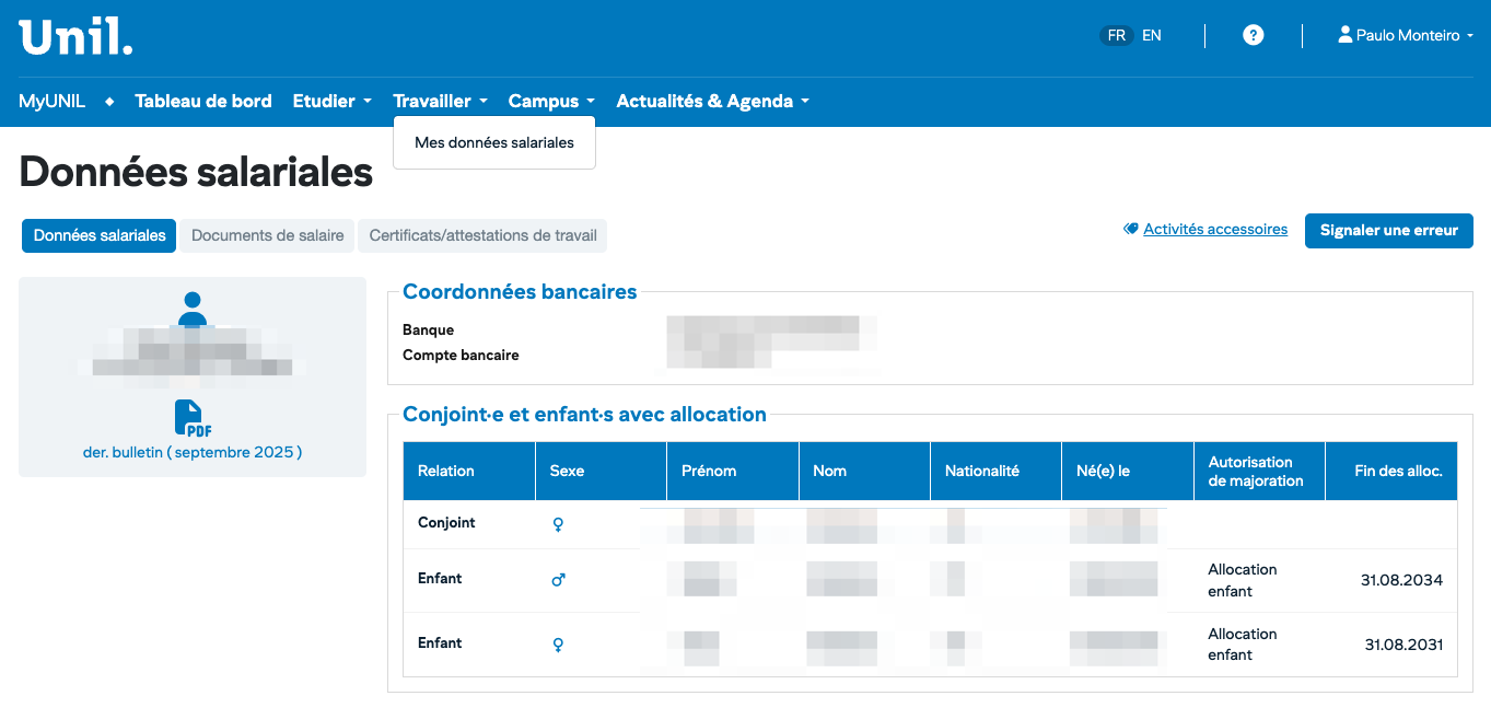La section Données salariales vous permet de consulter l'ensemble de vos informations liées à votre emploi à l'UNIL : bulletins de salaire, coordonnées bancaires, informations familiales et certificats de travail.