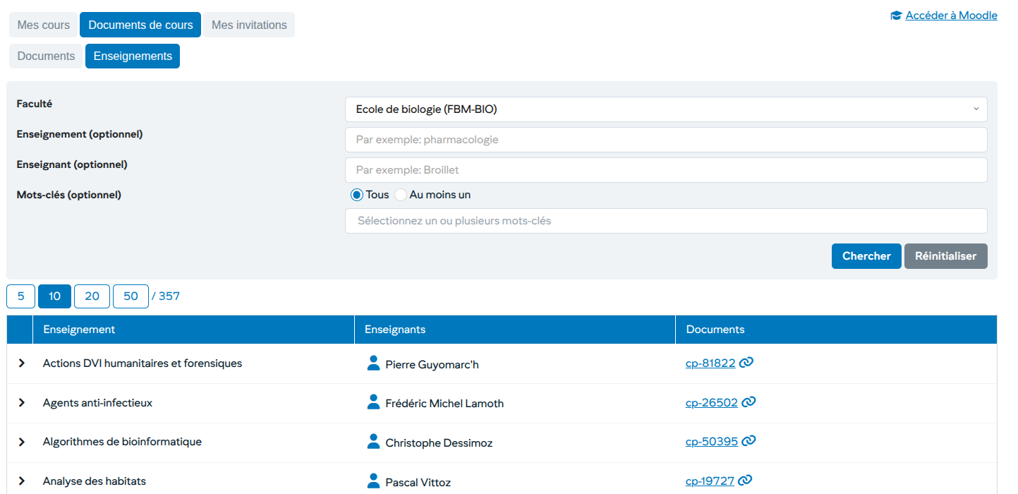 En sélectionnant l’onglet « Documents de cours » les étudiants ont accès à une recherche dans les documents des enseignements d'une faculté (Onglet Enseignements)
