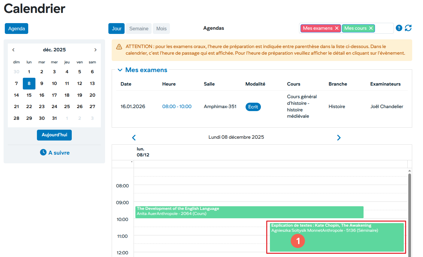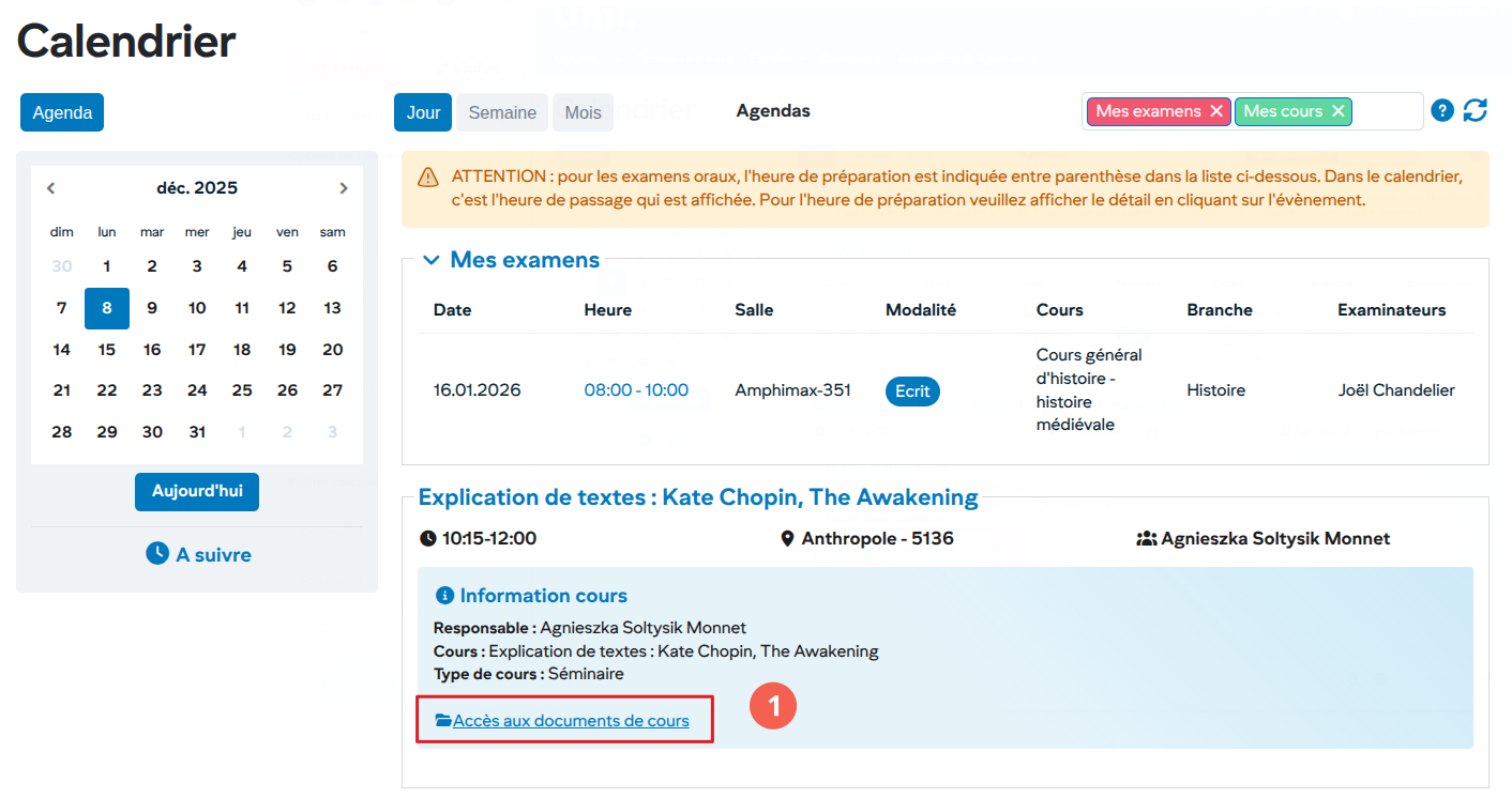 - Cliquer dans l’horaire sur un cours pour afficher le détail
