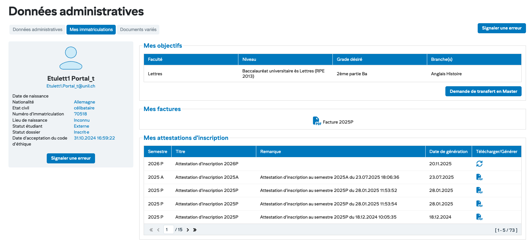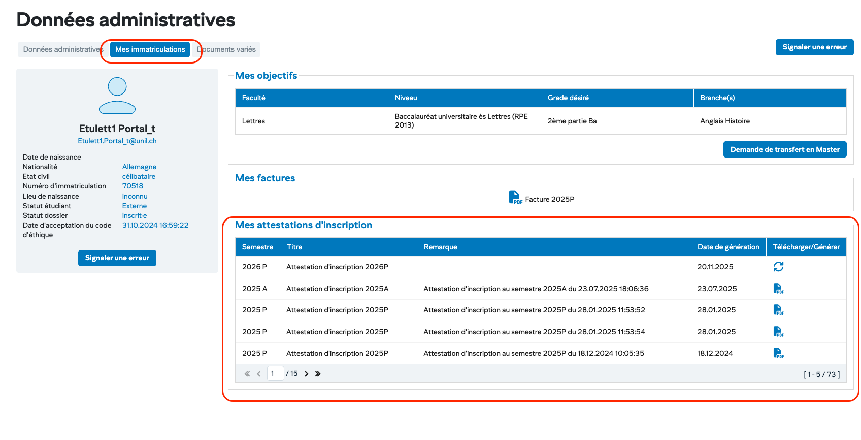 Les données administratives de l’utilisateur sont affichées dans cette page. Pour les étudiants, leurs immatriculations, ainsi que leurs attestations d’inscriptions aux différents semestres sont aussi listées.