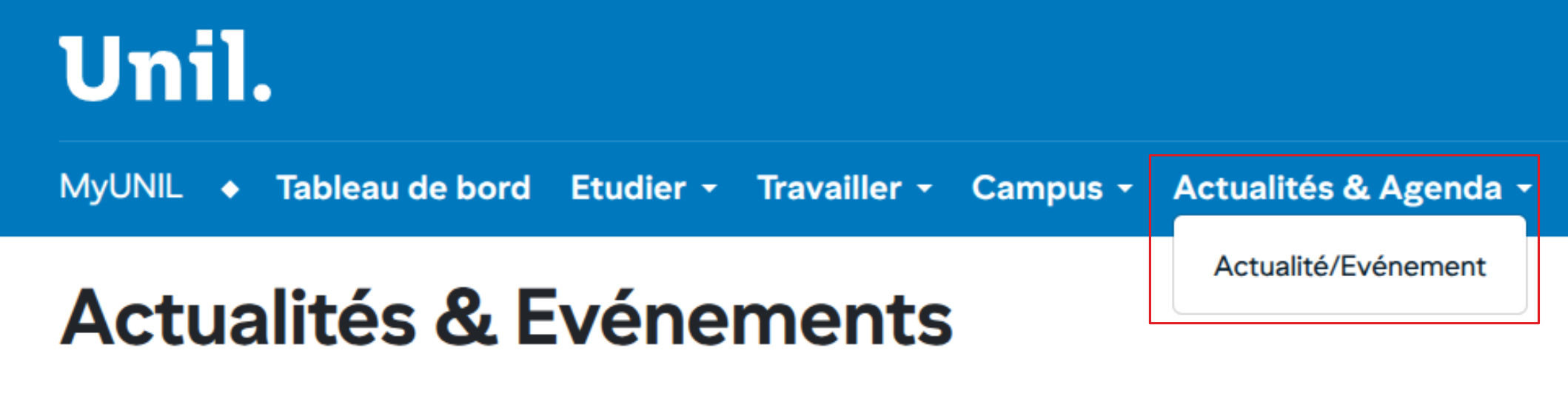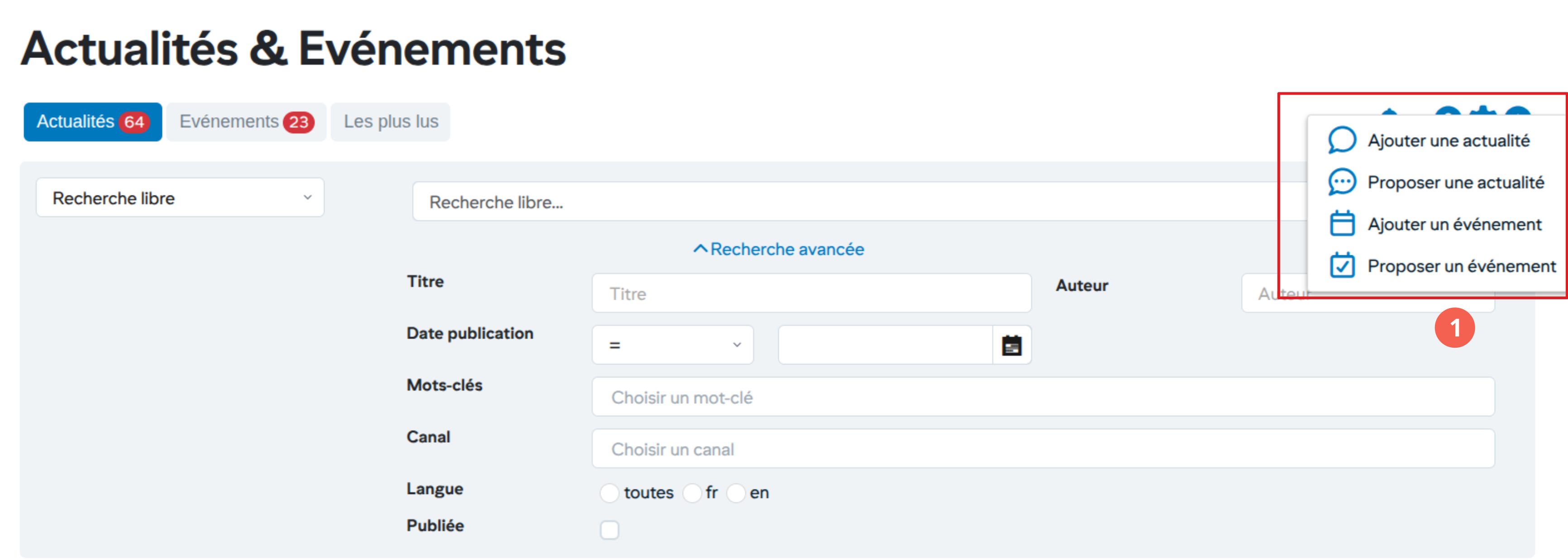 Les utilisateurs avec un droit d’écriture dans un des canaux d’actualités peuvent accéder à la gestion des actualités depuis l’onglet « Actualités/Evénements »