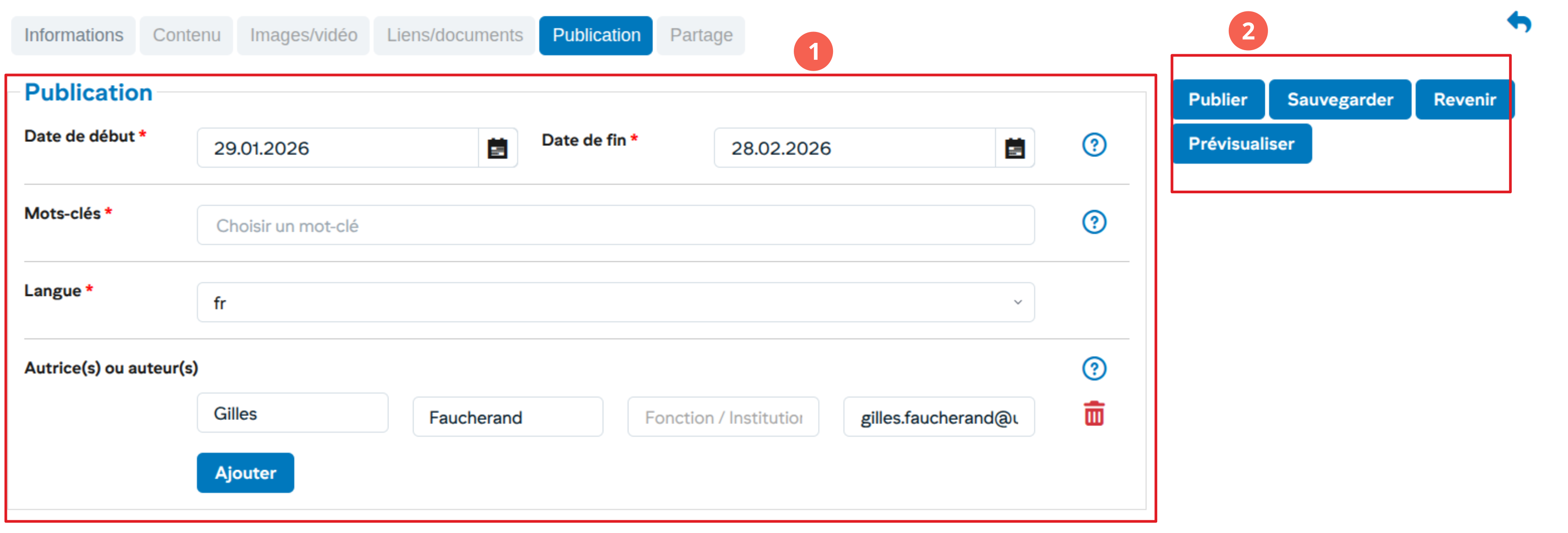 - Saisie des informations de publication (dates, mot-clés, auteurs et la langue)