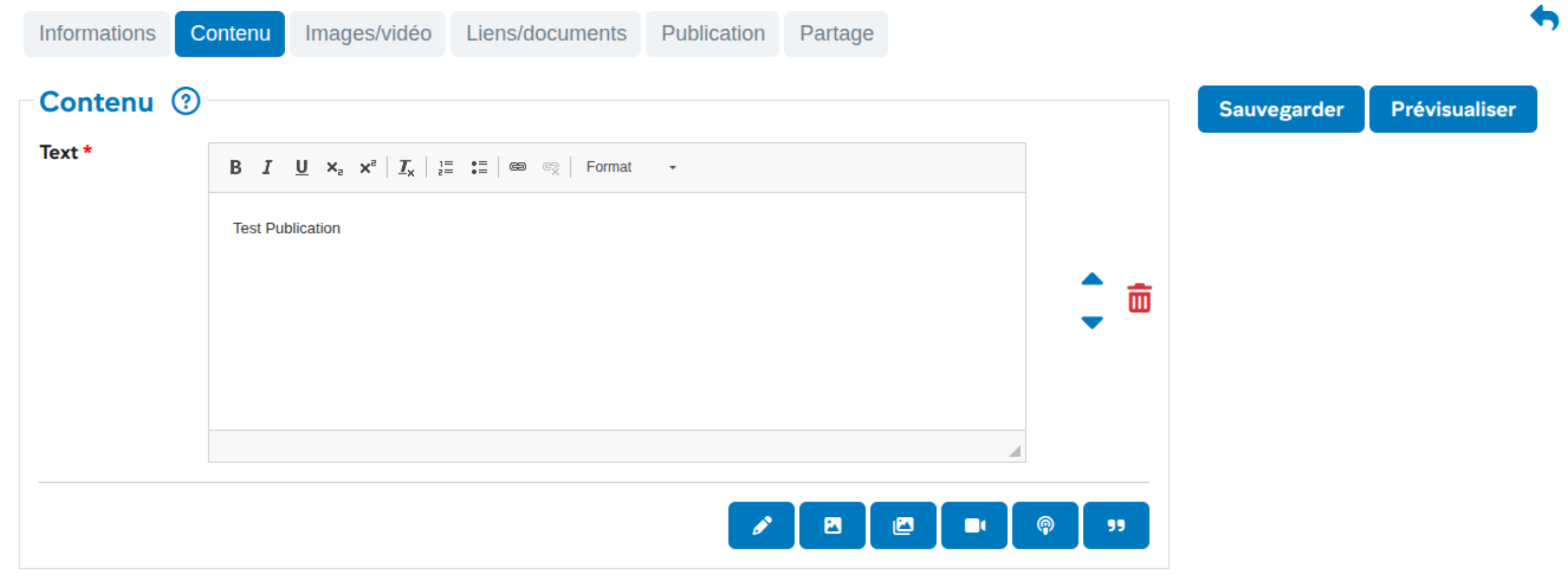 L'utilisateur peut ajouter plusieurs blocs textuels et des images. Après édition, il peut effacer ou trier les blocs à tout moment à l'aide des boutons situés sur la droite des blocs :