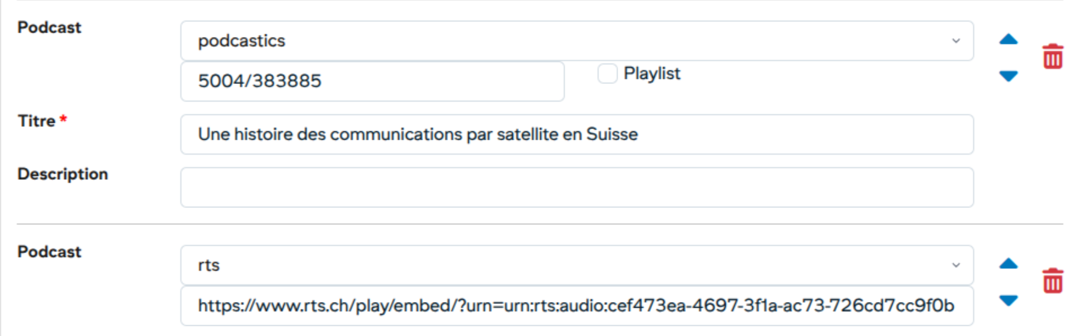 - Bloc podcast : permet d'ajouter un podcast au contenu (lecteur embarqué dans la page). Les format supportés sont :