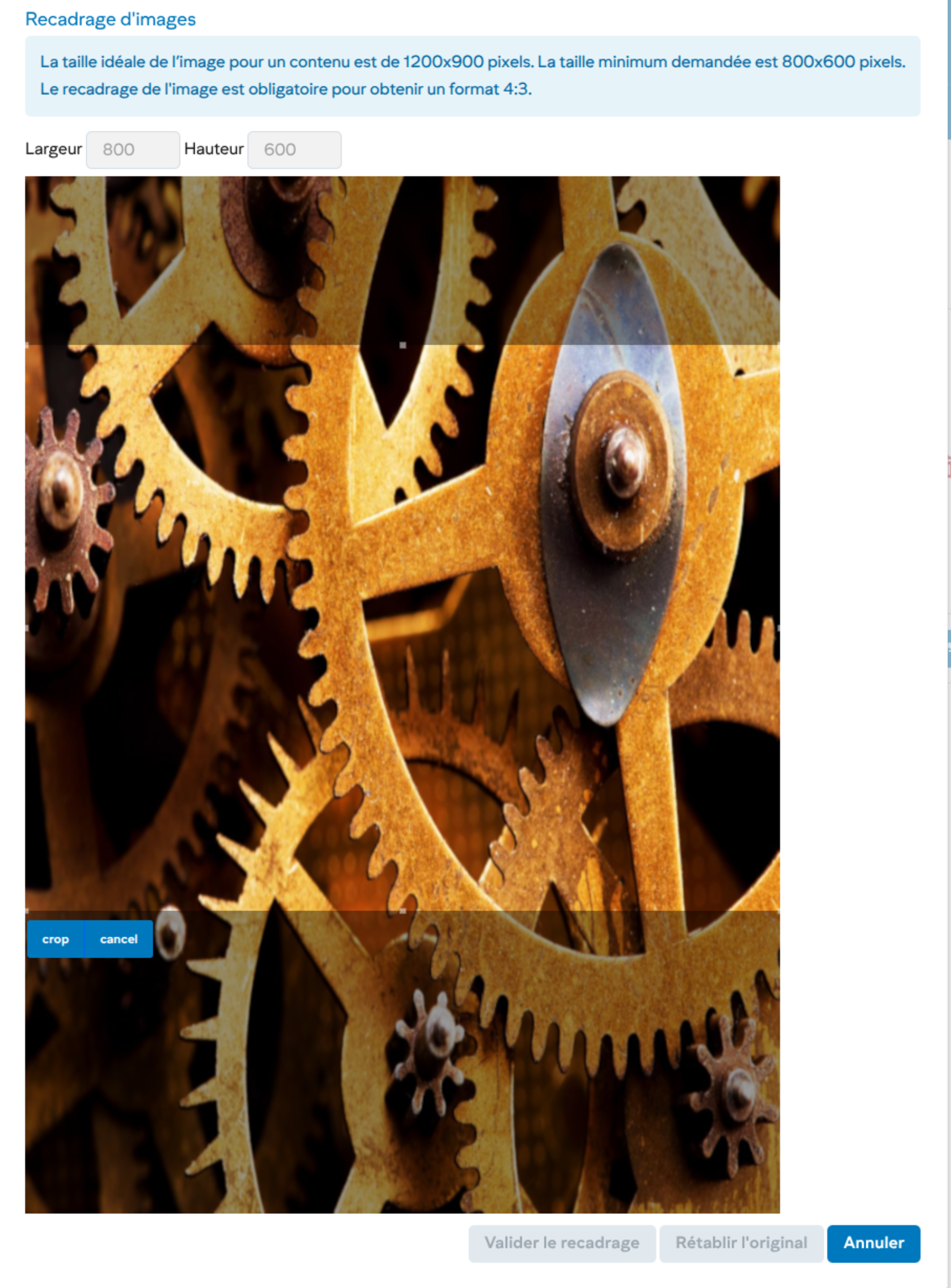 - Bloc image : l'utilisateur peut ajouter une image au format 4:3 ce qui nécessite un recadrage (crop). La zone rectangulaire ajustable avec la souris permet de prévisualiser le recadrage. Cliquer sur le bouton crop pour fixer le recadrage et ensuite cliquer sur le bouton Valider le recadrage pour ajouter l'image au contenu.