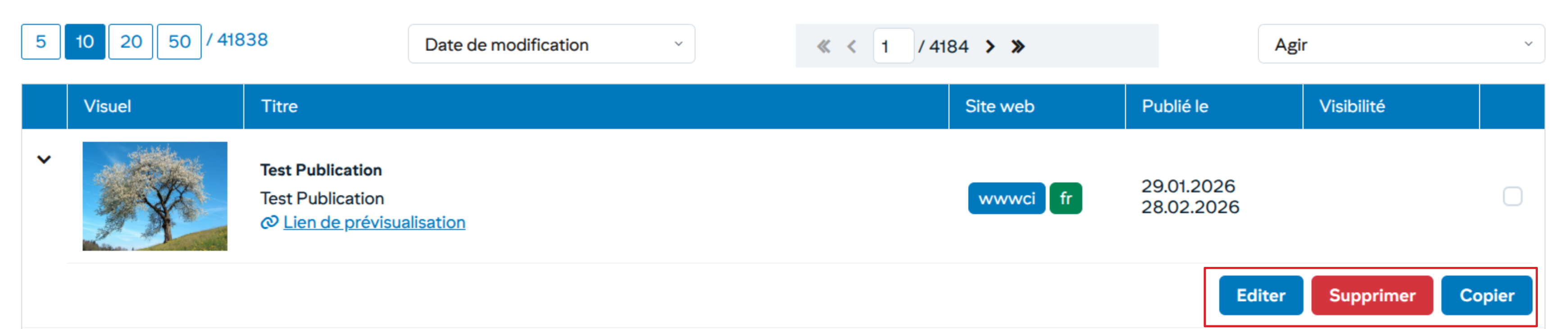 Depuis le détail de l'actualité, l'utilisateur peut éditer/supprimer/copier une actualité à tout moment