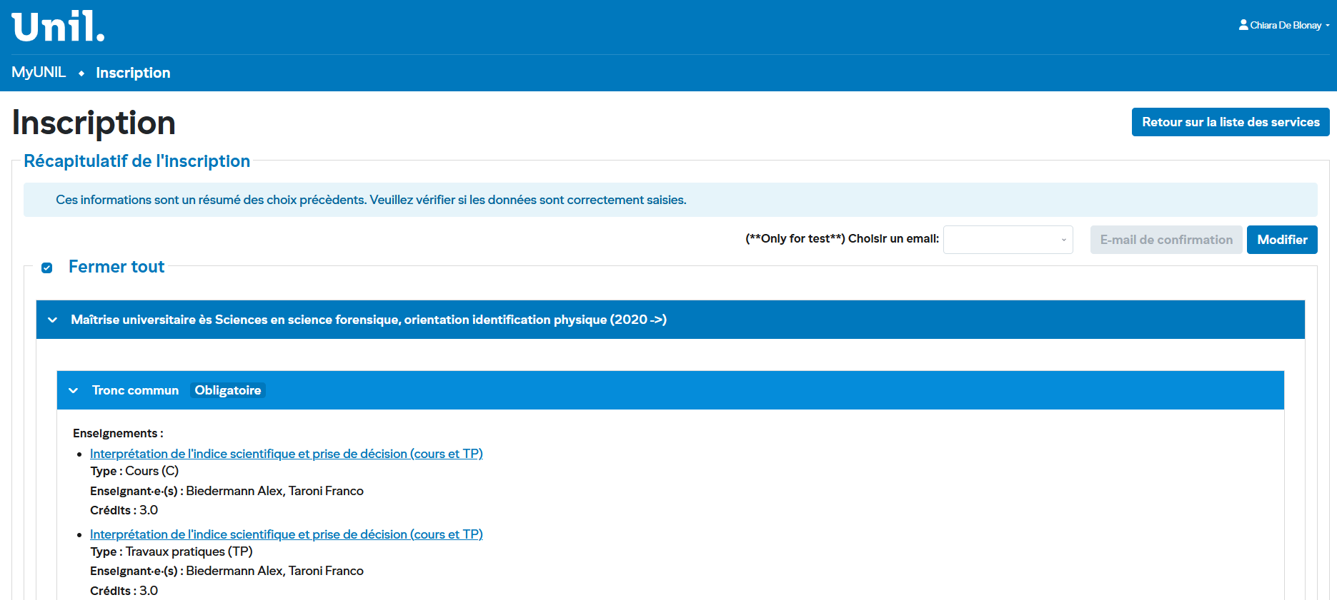 Important : Vérifiez soigneusement votre récapitulatif. Assurez-vous que chaque enseignement est bien inscrit dans le bon module.