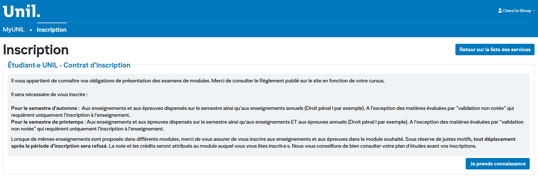 Cliquez sur « Je prends connaissance » pour valider la lecture du contrat et accéder à la page de sélection des enseignements.