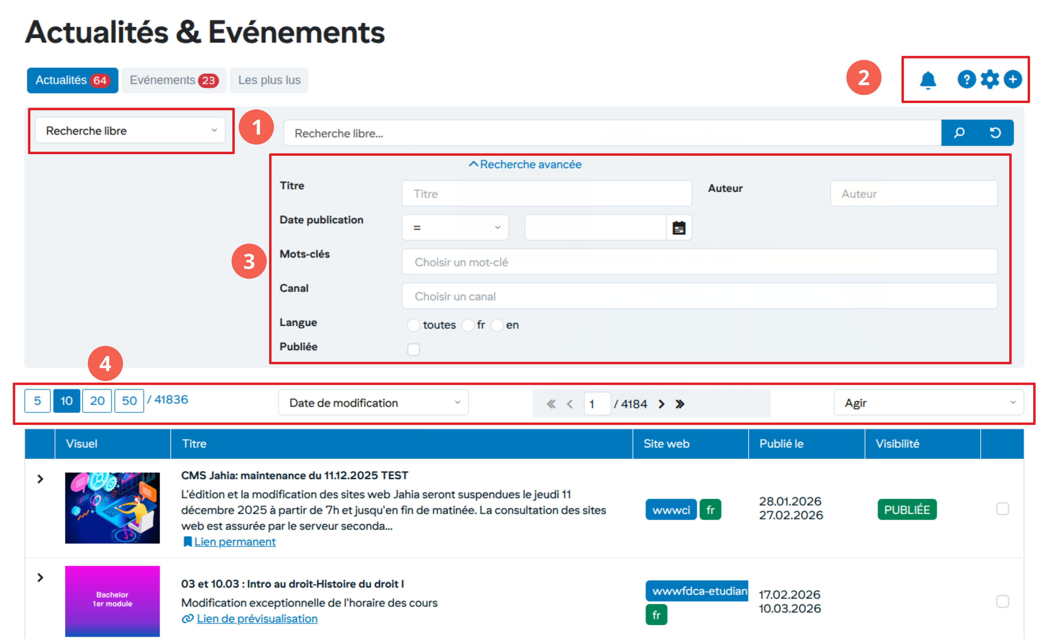 Interface de gestion des actualités et des événements
