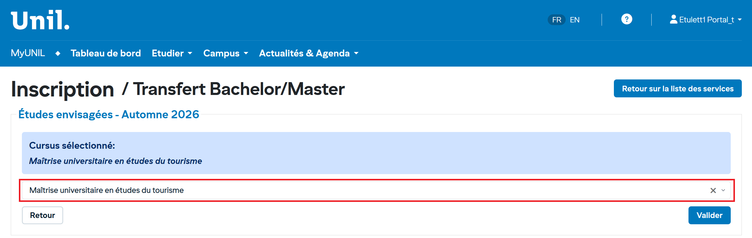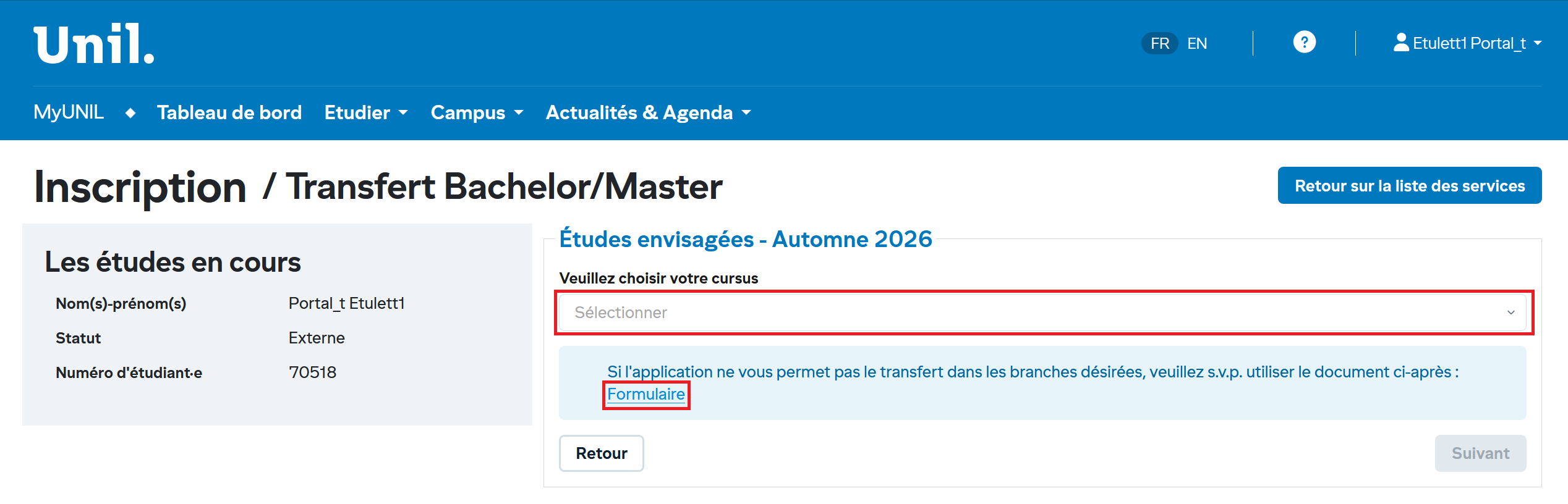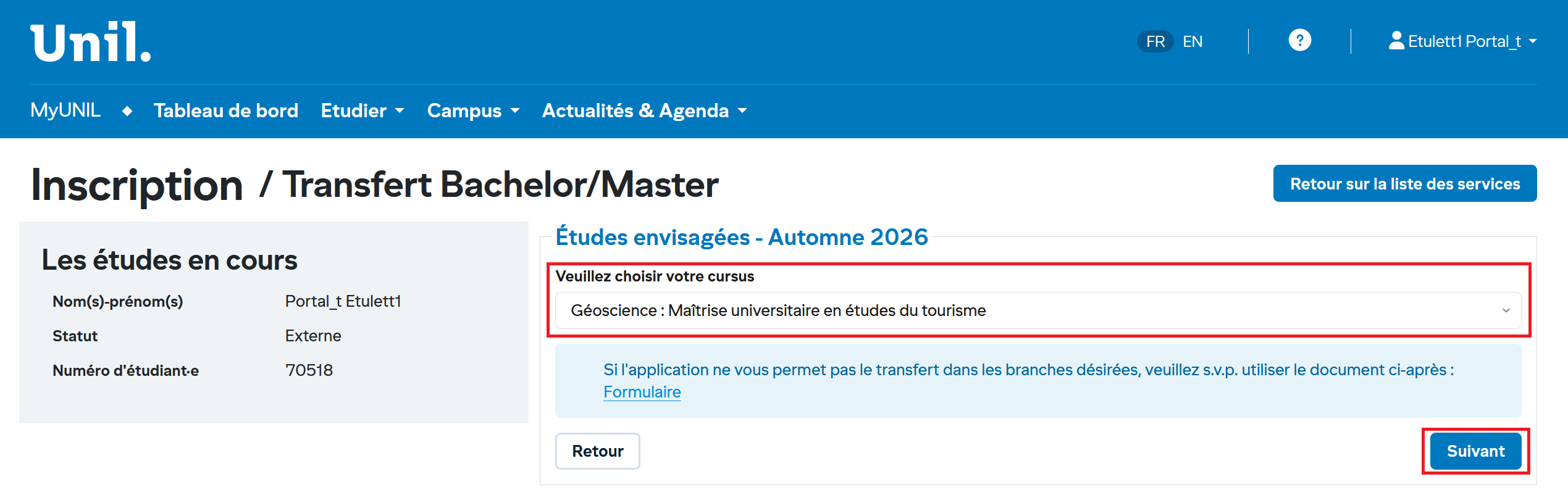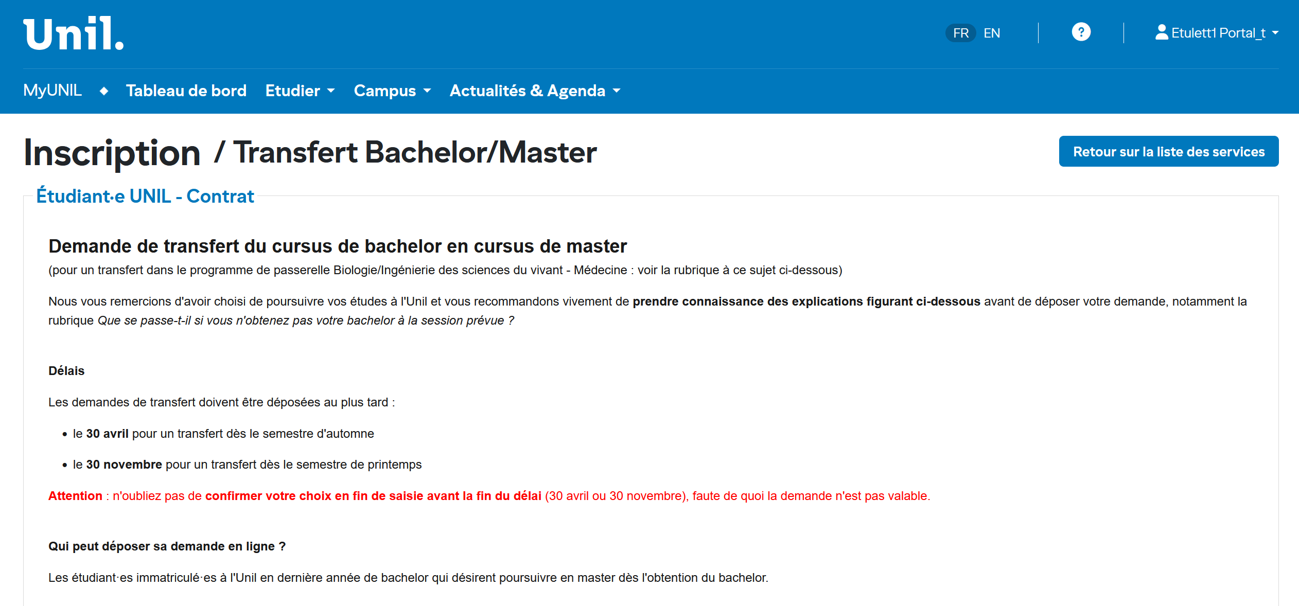 1. Accéder au service transfert bachelor/master