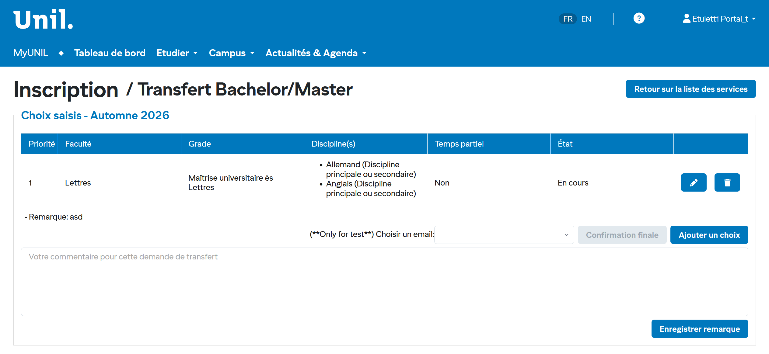 Cliquez sur l'icône bleue à droite de la ligne « Transfert Bachelor/Master » pour démarrer votre inscription.