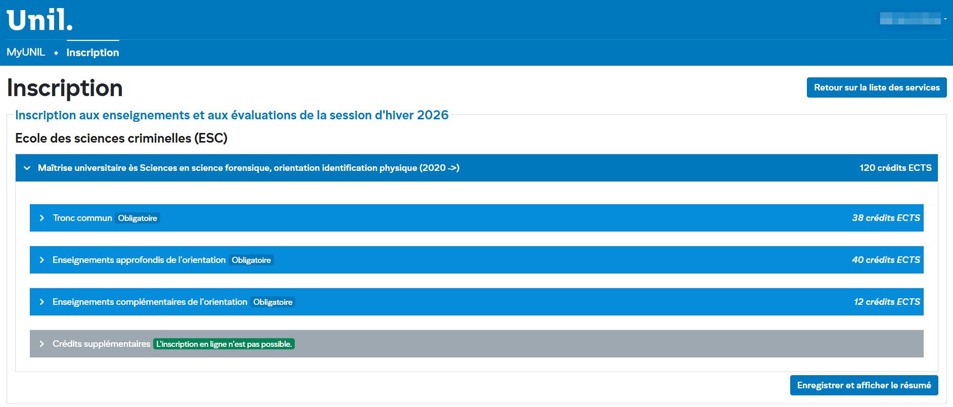 Votre cursus est affiché en haut (par exemple : Maîtrise universitaire ès Sciences en science forensique, orientation identification physique) avec le nombre total de crédits ECTS requis (ex. : 120 crédits ECTS).