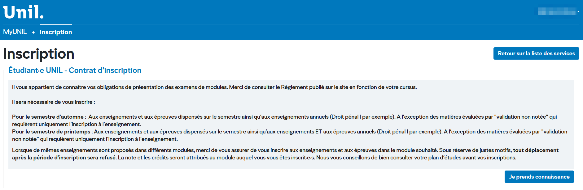 Cliquez sur « Je prends connaissance » pour valider la lecture du contrat et accéder à la page de sélection des enseignements.