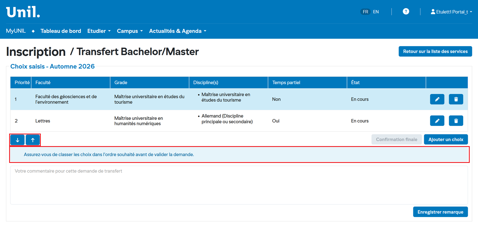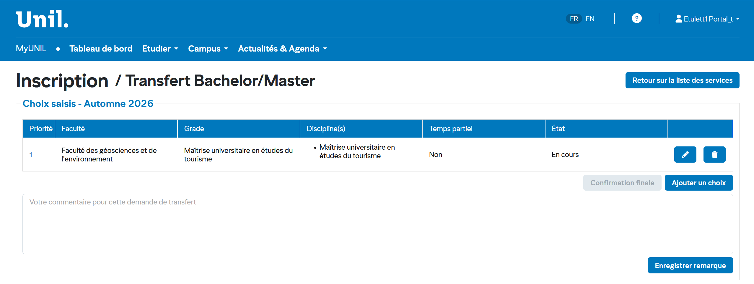 Note: Vous pouvez ajouter un commentaire en saisissant un texte afin de transmettre une information importante à votre faculté et cliquer sur "Enregistrer remarque"