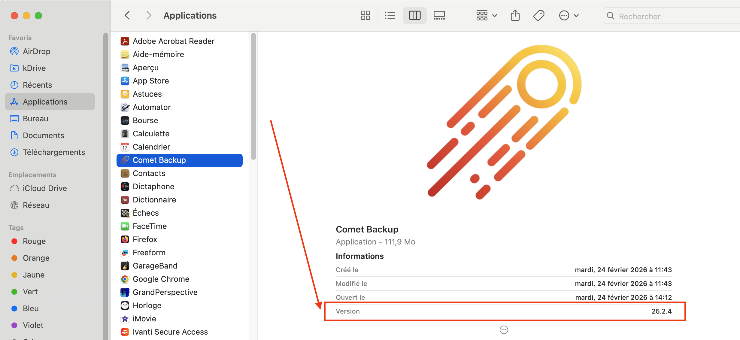 - L'ordinateur tourne sur mac et a été livré avant le 15 mais 2025 ? Regardez la version de CometBackup installée: