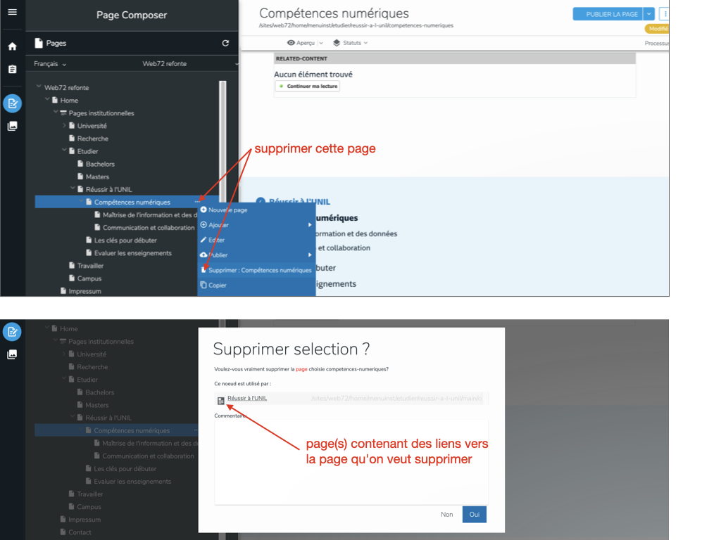 - attention : si la page comporte des pages filles, elles seront également supprimées