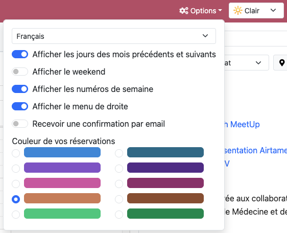 Des options de personnalisation (préférences d'affichage mais aussi abonnement pour recevoir une confirmation de vos réservations par e-mail) se trouvent dans le menu “Options” en haut à droite de la page.