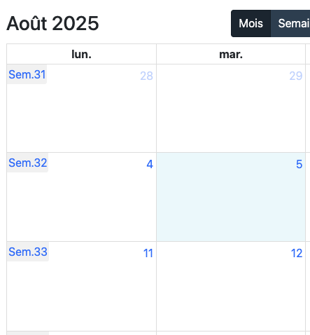 Le calendrier dispose de cinq vues différentes: Mois, Semaine, Jour, Planning mensuel et Liste.