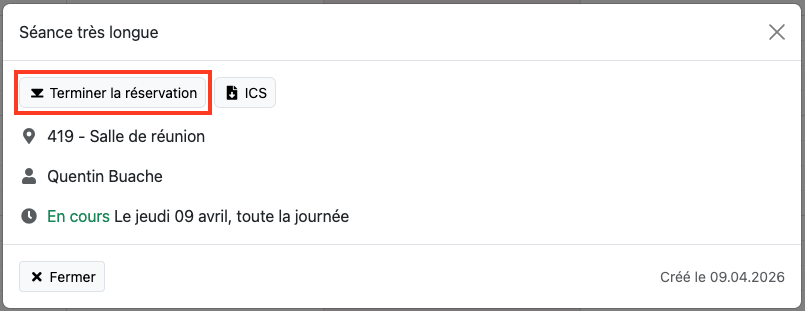 Le calendrier ne permet pas la suppression de réservation en cours. Vous pouvez malgré tout en raccourcir une en utilisant l'option "Terminer la réservation" dans les détails de celle-ci. Ceci calculera une nouvelle date de fin et libérera le temps restant.