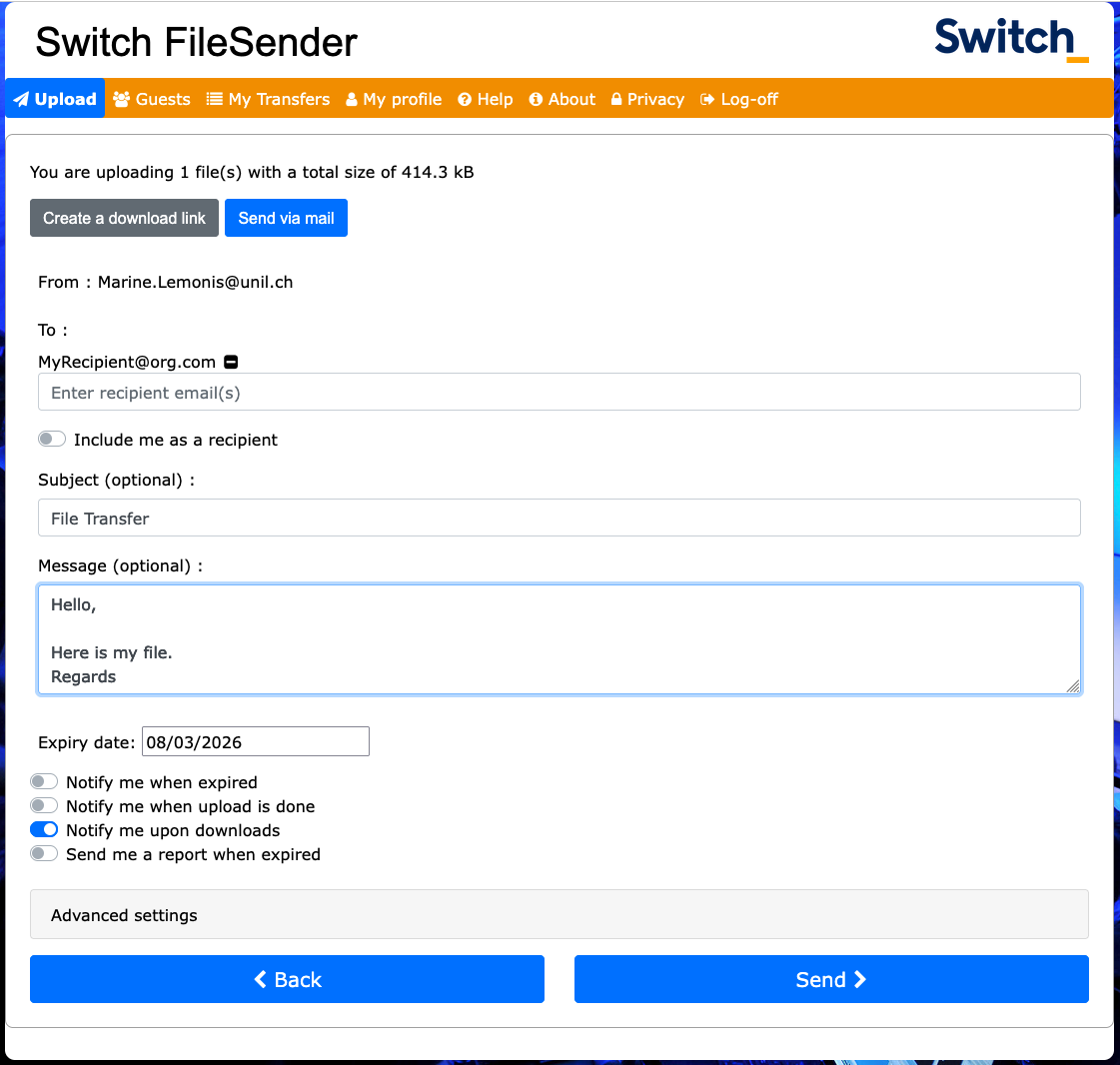 Send files witch SWITCH filesender