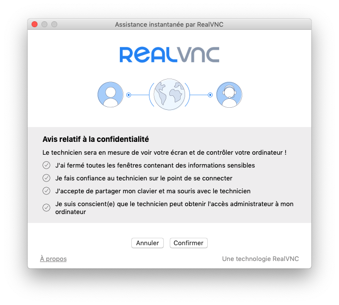 When the FBM IT support cannot come to your workplace, we use VNC Connect to provide remote support. This service is available for all configurations (Windows, OSX, Linux) and allows your IT manager to view your screen, send you documents, and take remote control of your computer.