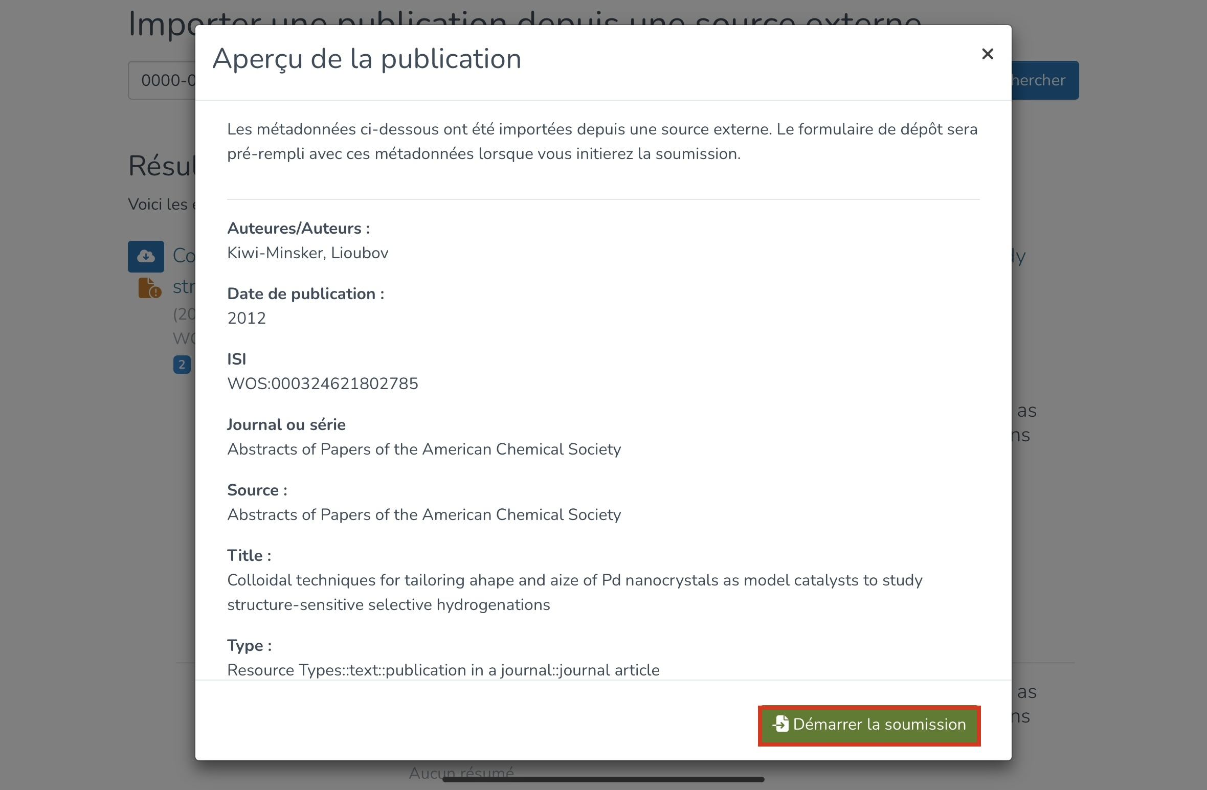 - Une fenêtre s’ouvre avec les métadonnées de la publication. Cliquez sur « Démarrer la soumission » pour poursuivre.
