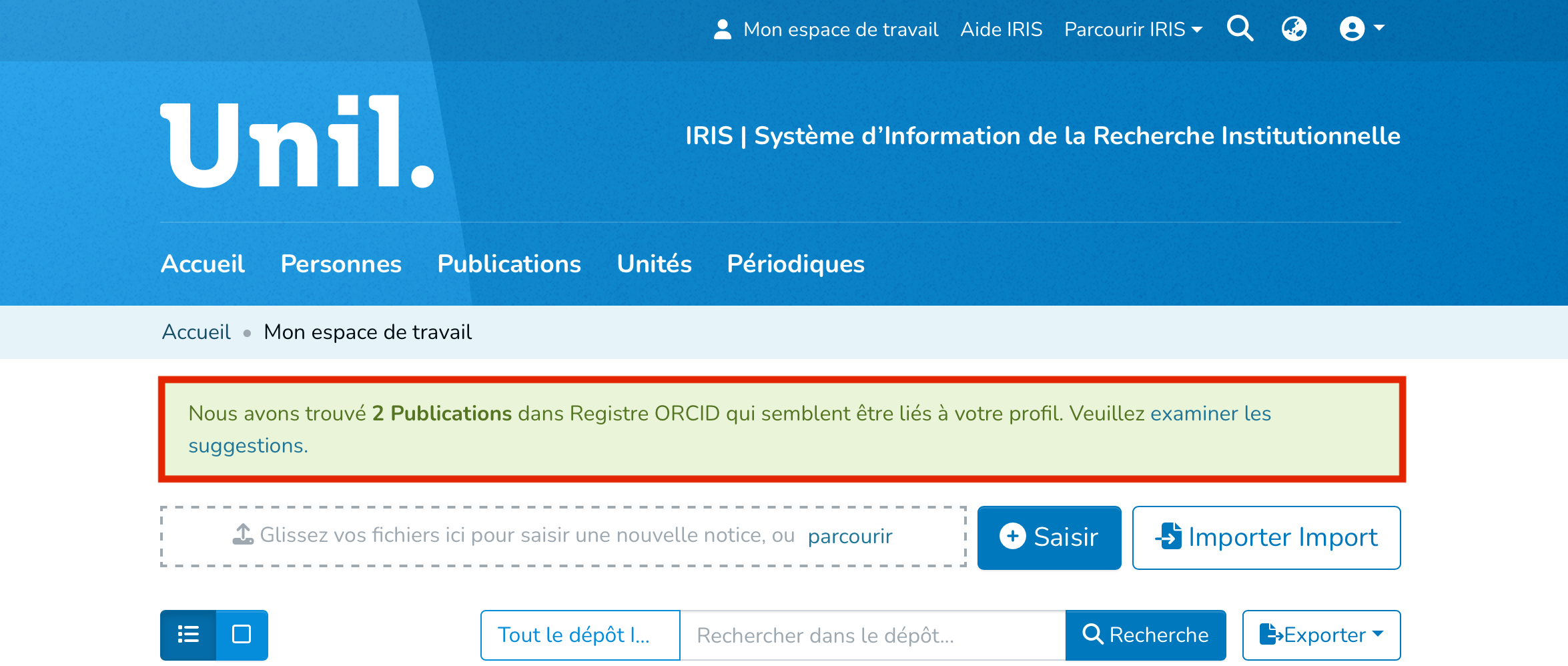 Si une publication est détectée sur votre profil ORCID, vous devriez recevoir une notification dans IRIS vous suggérant qu’il y a des publications à importer. Cliquez sur « examiner les suggestions » pour commencer l’importation.