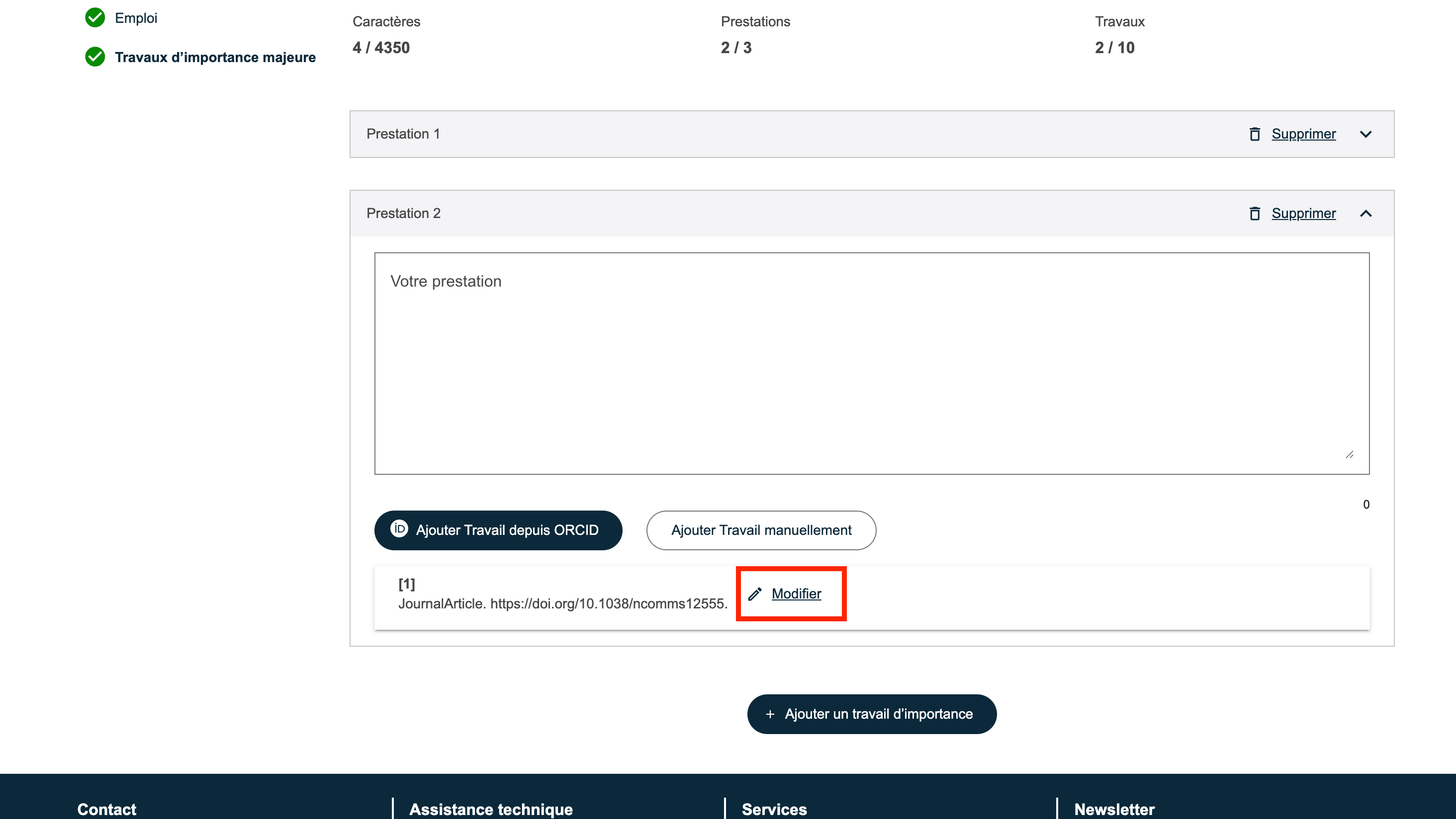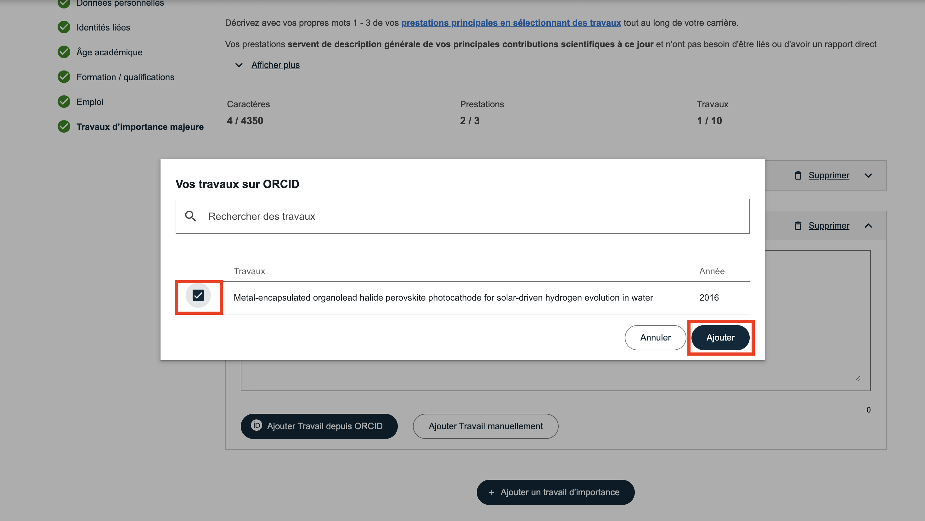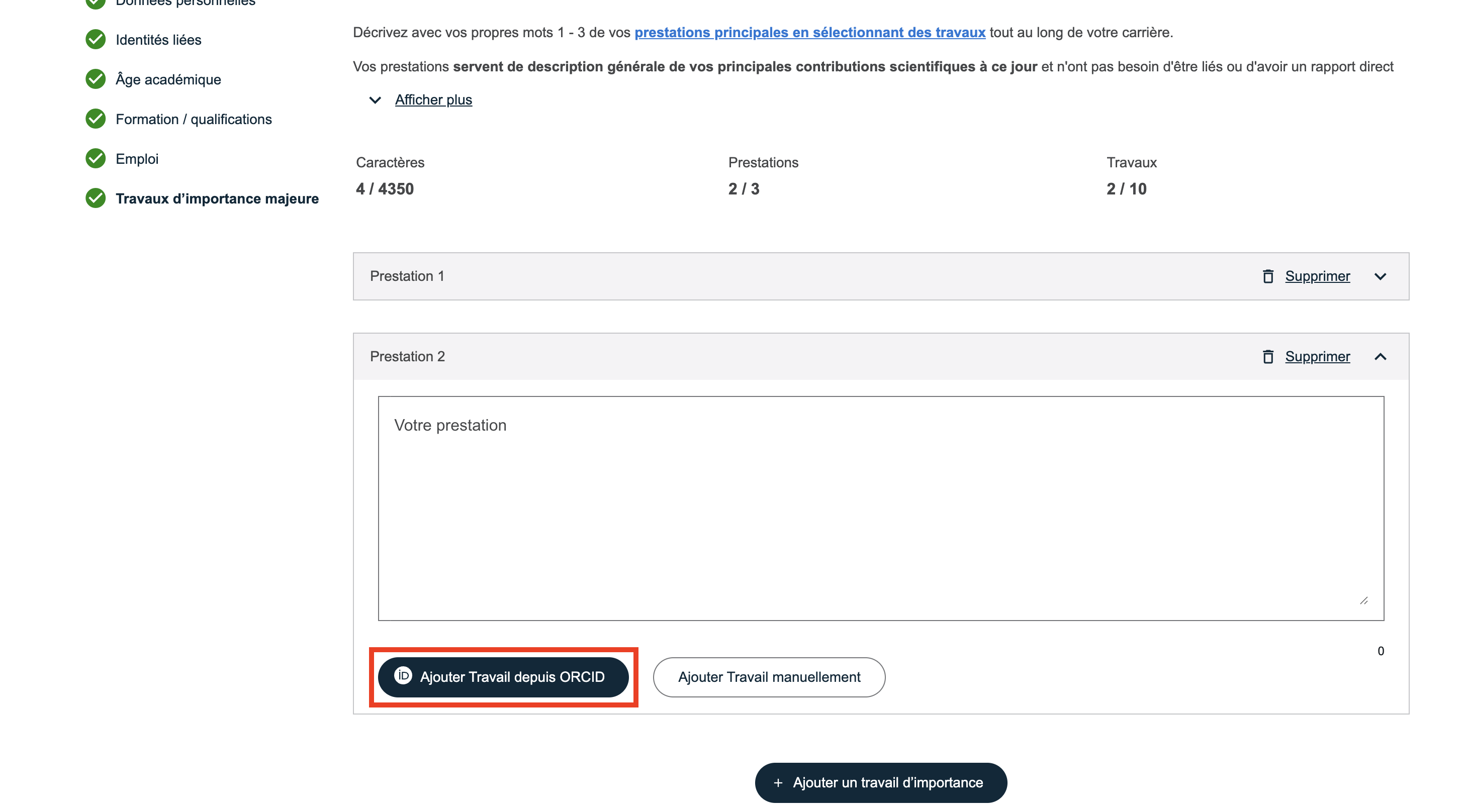 2. Pour importer une référence dans une nouvelle prestation, cliquez sur « Ajouter un travail d’importance », puis sur « Ajouter travail depuis ORCID ». Si la prestation existe déjà, cliquez directement sur « Ajouter travail depuis ORCID » sous la prestation concernée.