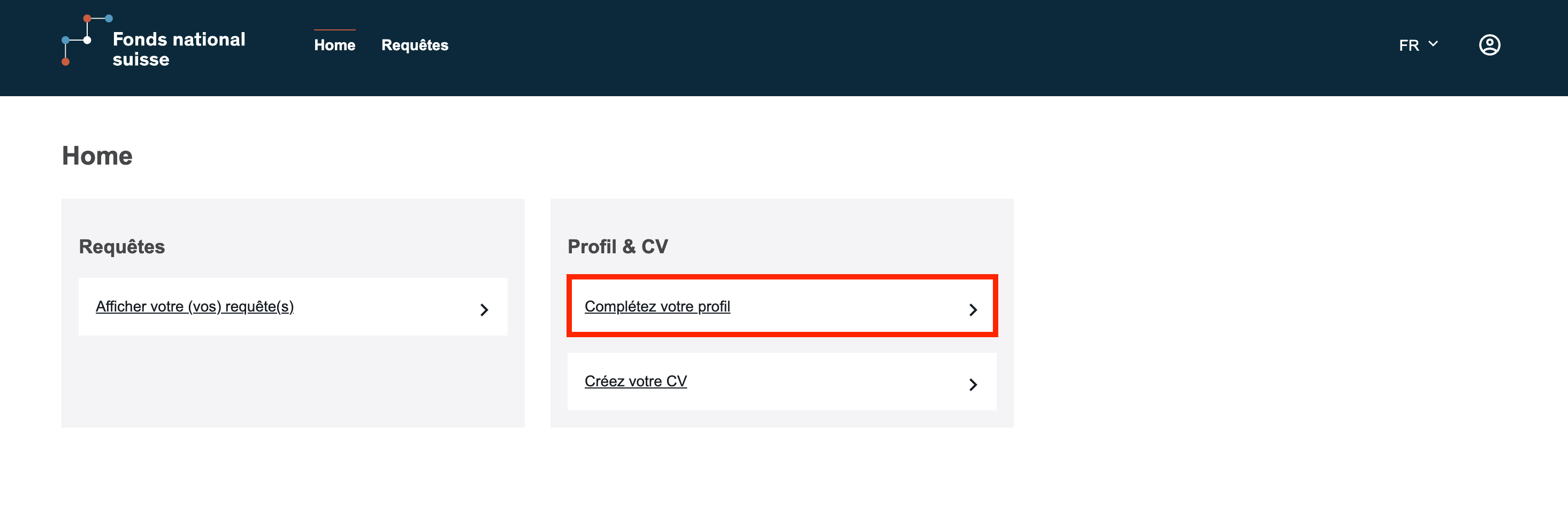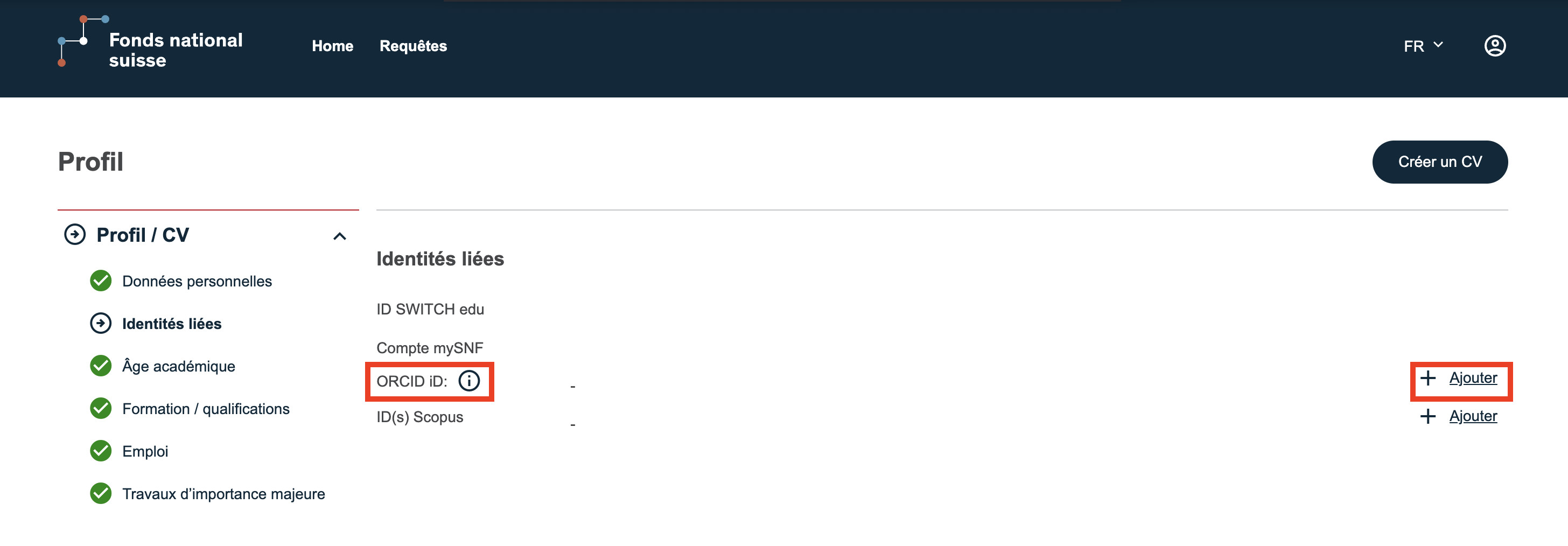 Il est aussi possible de relier votre compte ORCID au portail FNS. Cette connexion est particulièrement importante, car elle permet d’importer vos références depuis ORCID vers votre profil FNS et est requise pour la soumission d’une requête.