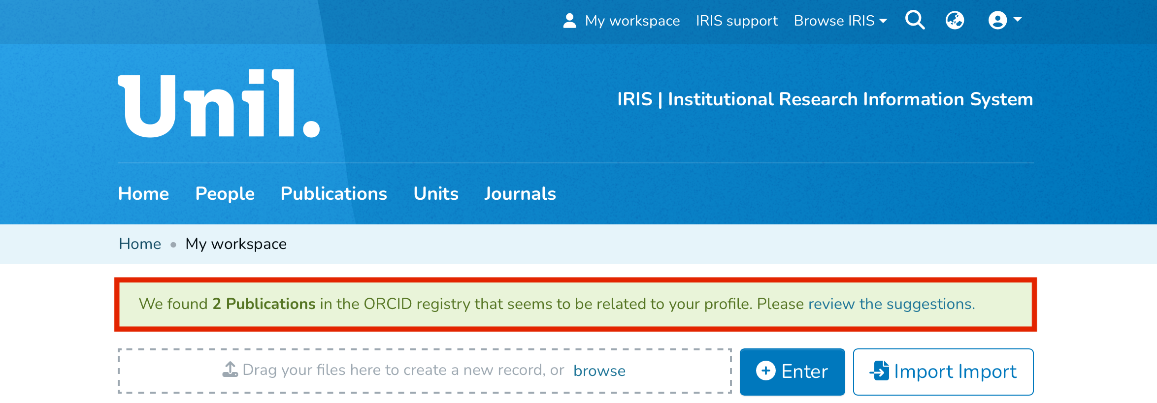 If a publication is detected on your ORCID profile, you should receive a notification in IRIS suggesting that publications are available for import. Click on "review the suggestions" to begin the import process.