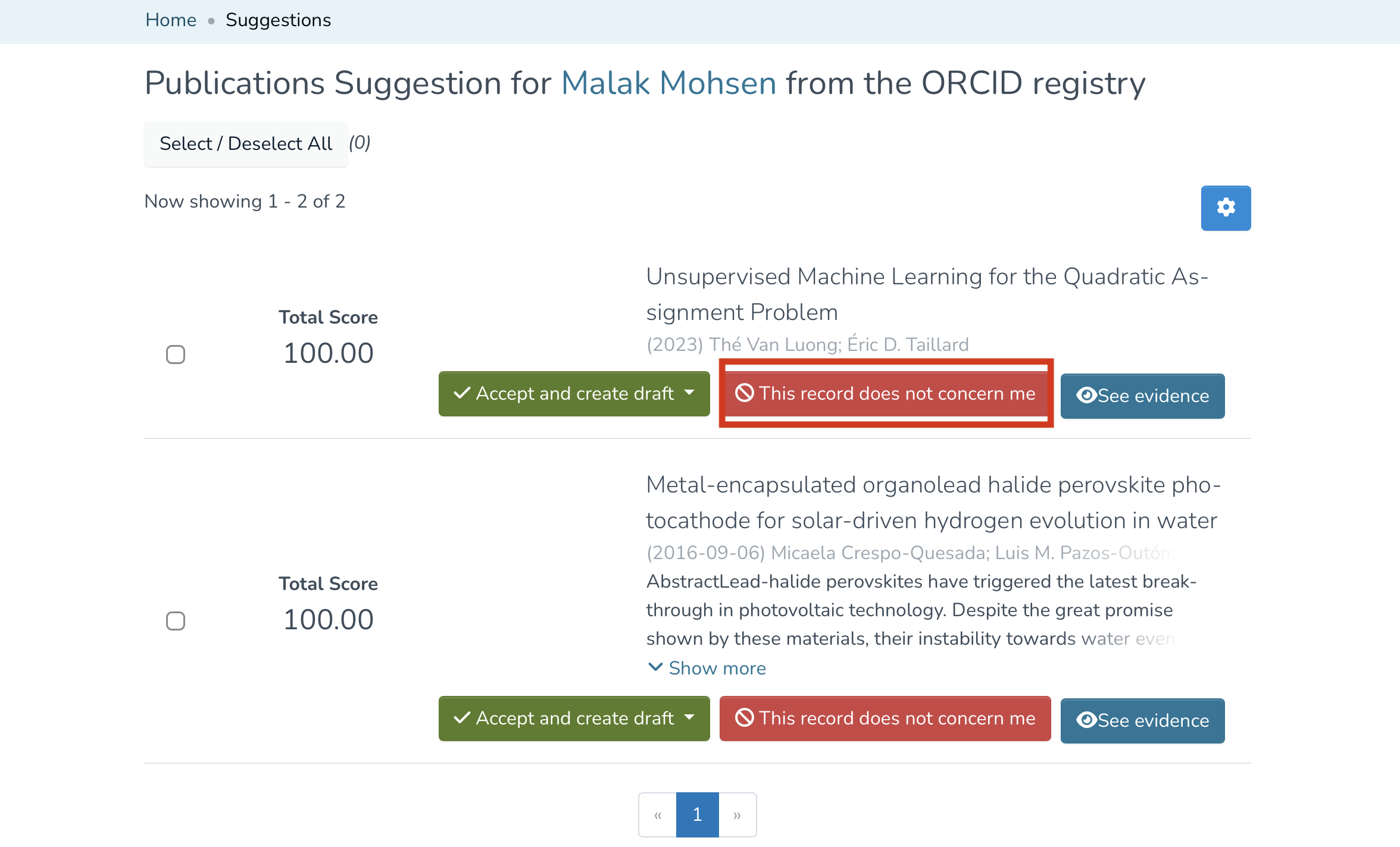 - IRIS will then display a list of publications retrieved from ORCID. If any of the publications do not concern you, simply click “This record does not concern me.”